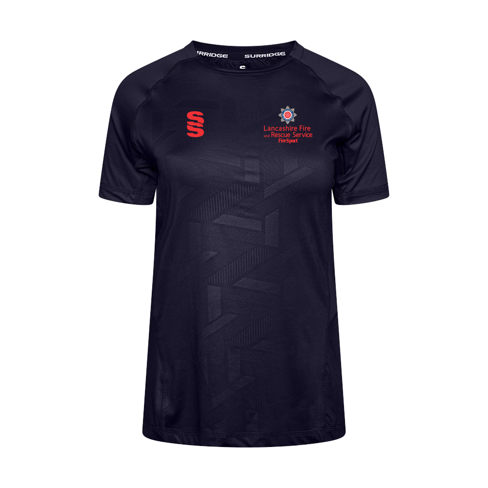 Crew neck fitted polyester interlock material with highly modern print to the from panel